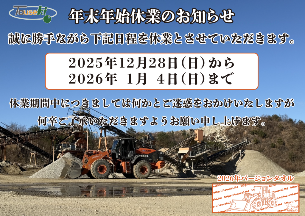 年末年始休業のお知らせです 2025 12/26 総務部 2025年12月26日 総務部 東石新聞2025年12月号 この記事を書いた人 ts_mayu 主に東京石材株式会社の経理部門を担当しています。 石材事業工場では、何もできません。 ICT部門では見習いです。 フットサル事業では、予約管理担当です。 ブログでは東京石材株式会社の近況報告や、イベントの告知などを主に発信していきます。 チワワが大好きです 18歳のチワワ君24時間介護中で日々幸せを感じております(2025年9月) どうぞ宜しくお願い致します。 関連記事 東石新聞2025年7月号 2025年7月1日 東石新聞2025年6月号 2025年6月1日 令和7年度営業カレンダー 2025年4月1日 東石新聞2025年3月号 2025年3月1日 2023謹賀新年~東石新聞2023年1月号~ 2023年1月1日 東石の良いストーン【e-stone】シリーズご紹介 2022年8月24日 光亀石(きせき)特設ページを制作しました 2022年6月27日 『大田原市なす風土記の丘湯津上資料館』 2022年6月10日
